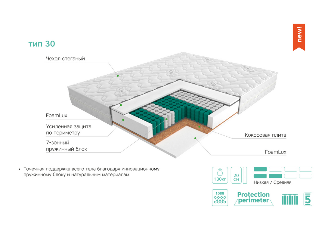 Усиленная защита по периметру из современного, эластичного, гипоаллергенного материала FoamLux удерживает пружинный блок, предотвращает проседание и потерю формы.