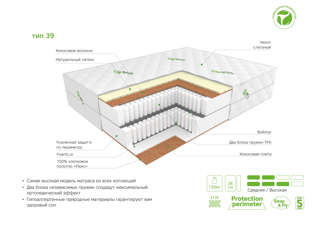 Матрас EOS Идеал 39 – самая высокая модель матраса из всех коллекций. Два блока независимых пружин создадут максимальный ортопедический эффект. Гипоаллергенные природные материалы гарантируют здоровый сон.