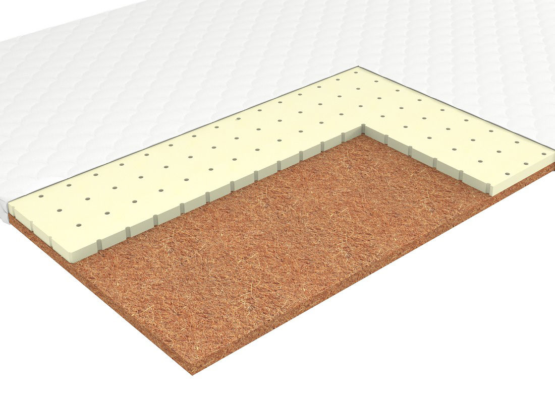 ·Кокосовое волокно. Натуральный гипоаллергенный материал. Благодаря пропитке волокна прочно скреплены в цельную плиту. Кокосовое волокно придает матрасу жёсткость и обладает бактерицидными свойствами.