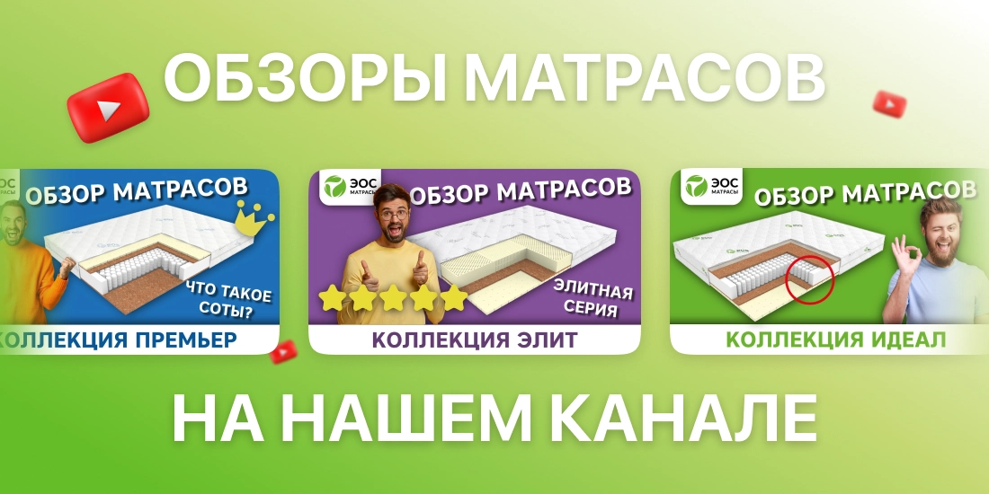 Это фирменный  ютуб-канал компании ЭОС. Здесь вы можете посмотреть обзоры матрасов нашего производства, узнать о натуральных и экологически чистых материалах, из которых изготовлены наши матрасы, подушки и прочие аксессуары для сна (наматрасники, топперы, одеяла, постельное бельё и даже кровати!). Разобраться, какие виды матрасов бывают и в чём разница между независимым пружинным блоком и зависимым, а также понять что лично вам лучше подойдет — пружинный блок или беспружинный матрас. Кроме этого, мы рассказываем о здоровом сне, о том что нужно сделать, чтобы высыпаться по ночам, о том как правильно выбрать матрас или подушку. Мы поможем вам подобрать для себя и своих детей правильную жёсткость матраса, а также подскажем что вам больше подойдёт — пружинный блок, латекс, пена или пена с эффектом памяти.